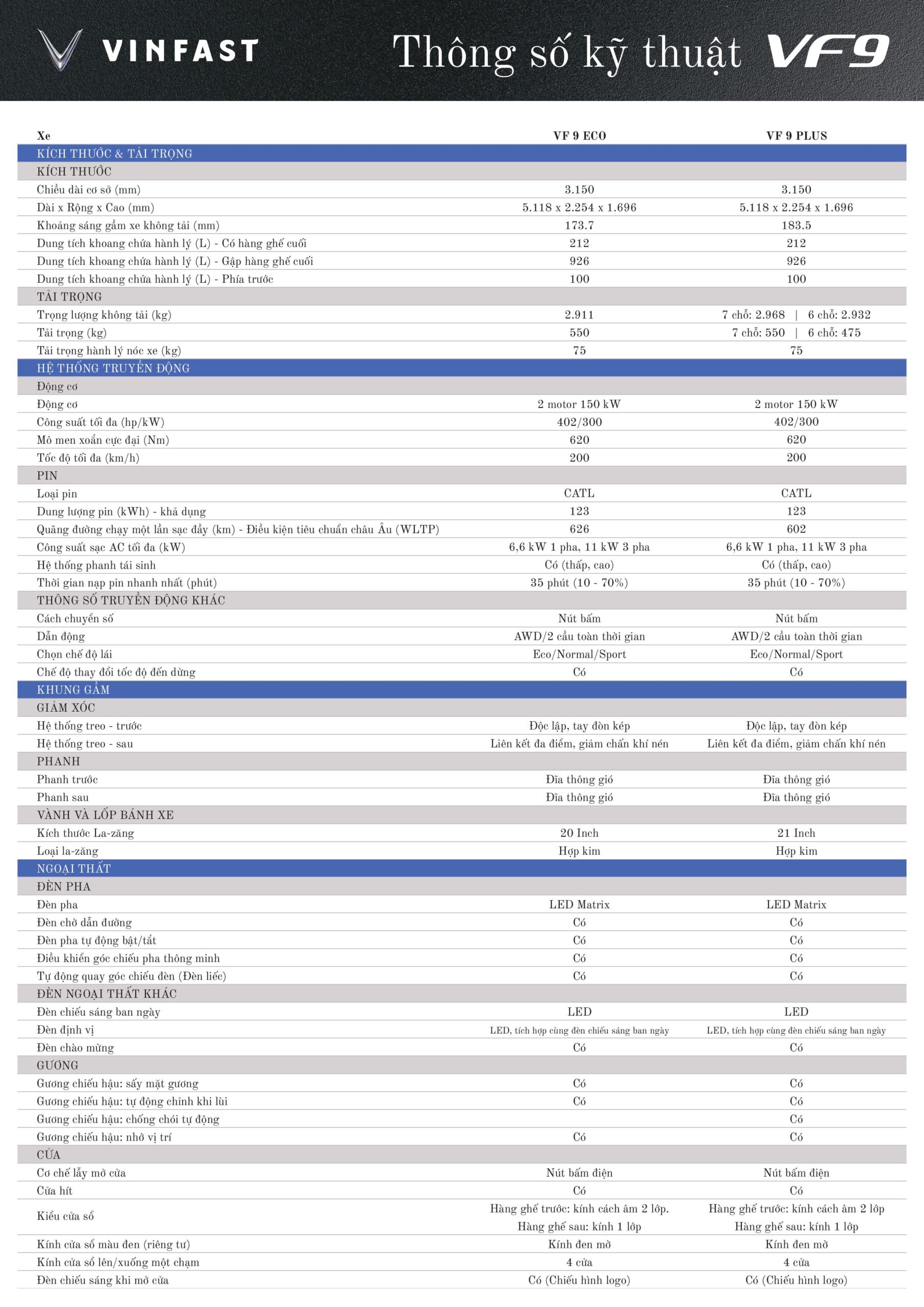 Theo công bố từ nhà sản xuất, VF 9 có kích thước dài x rộng x cao lần lượt là 5.120 x 2.000 x 1.721mm và chiều dài cơ sở 3.150mm.