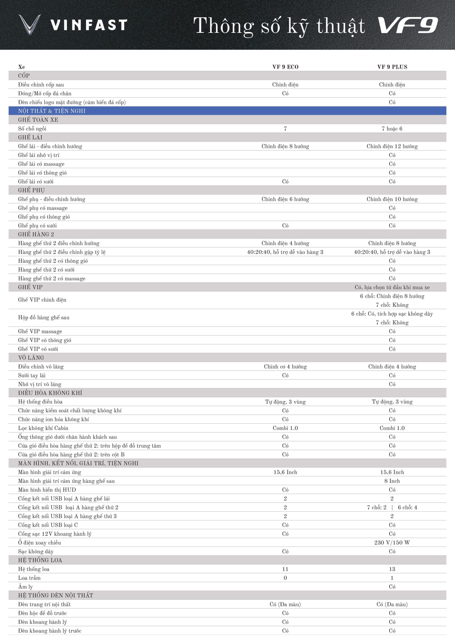 VinFast VF 9 là một chiếc SUV 3 hàng ghế và sẽ có sẵn trong các phiên bản 6 và 7 chỗ ngồi. Trong đó, phiên bản 6 chỗ sẽ có ghế thương gia, đi kèm chức năng massage ở hàng ghế thứ hai.